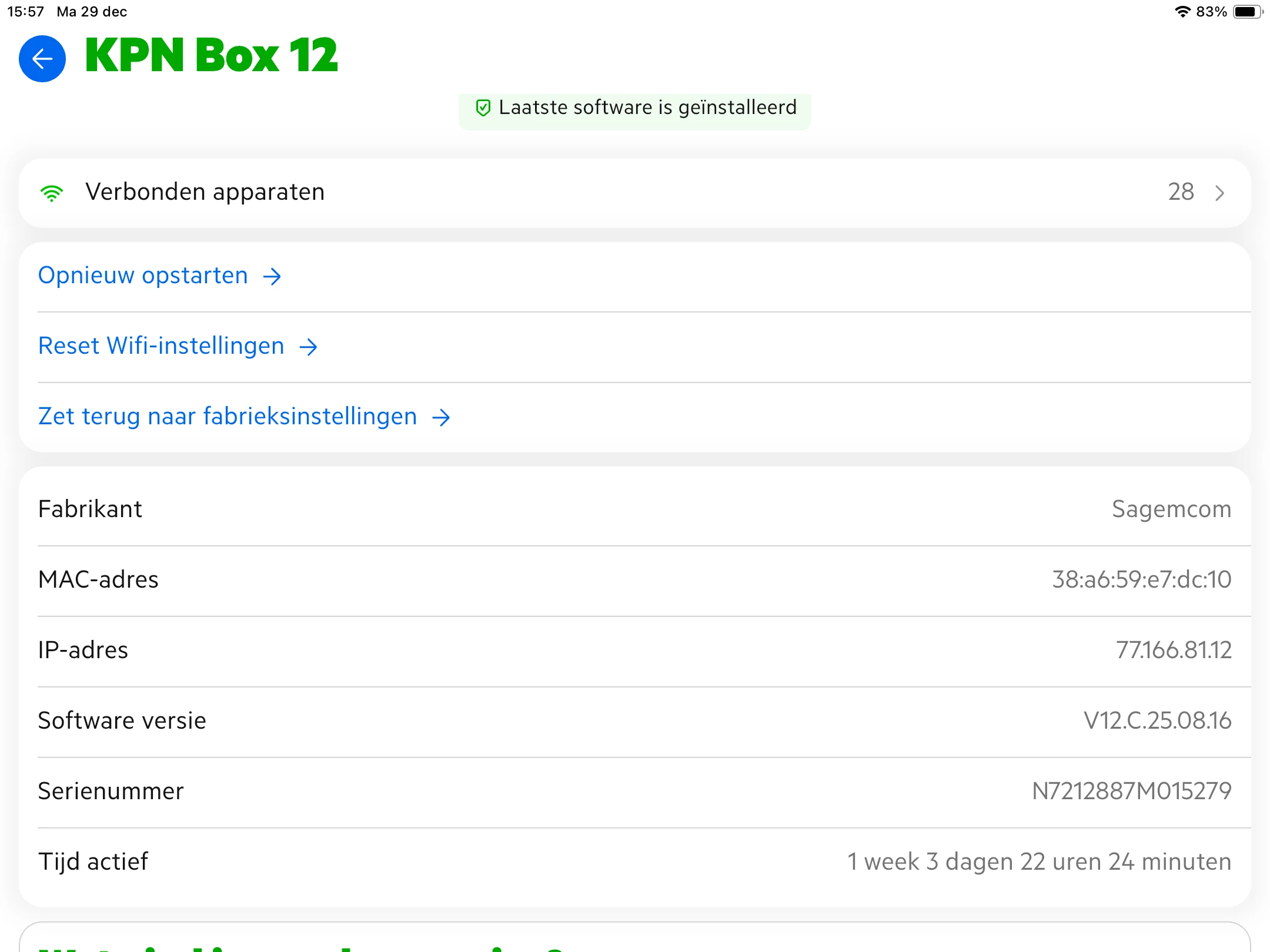 Ik heb een KPN-router V12 met 3× SuperWifi 2. De installatie is door KPN geleverd en geïnstalleerd in januari 2023 en heeft ruim 2 jaar goed gewerkt. Sinds 3–4 maanden is er een structureel probleem: