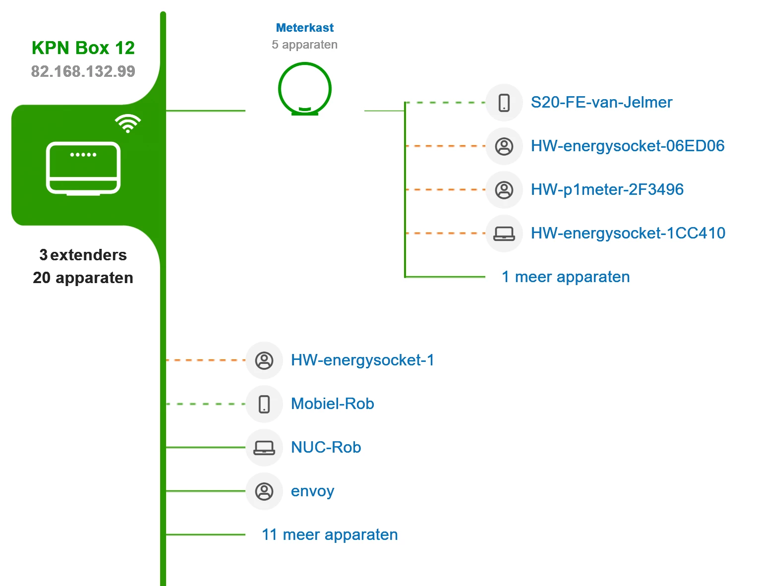 Echter zie ik van de 3 super wifi punten, alleen diegene nog die rechtstreeks op het modem is aangesloten en in de meterkast staat. De overige 2 (in de woonkamer en slaapkamer eerste verdieping) zijn niet meer zichtbaar. Wel worden er dan 3 extenders genoemd?