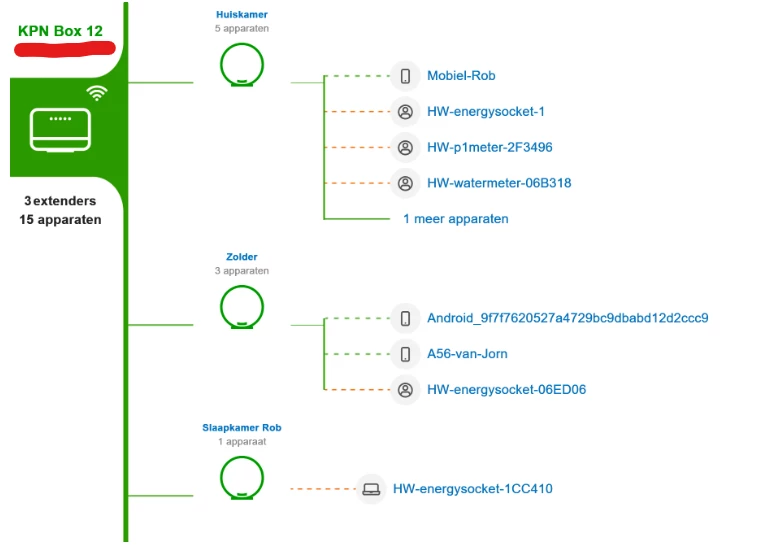 Echter zie ik van de 3 super wifi punten, alleen diegene nog die rechtstreeks op het modem is aangesloten en in de meterkast staat. De overige 2 (in de woonkamer en slaapkamer eerste verdieping) zijn niet meer zichtbaar. Wel worden er dan 3 extenders genoemd?