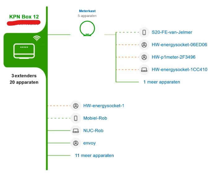 Onderstaande is nu mijn topologie. En daar gaat iets goed fout. Ik had altijd een goed werkend mesh netwerk (via Orbi Netgear) met een 2e netwerk via de KPN Super wifi punten (3). Nu heb ik mijn Orbi netwerk afgebouwd en draai voor Wifi nog alleen op de zwarte KPN Super Wifi boxjes. Dat werkte prima. Tot een week of zo geleden (software update? herstart complete netwerk na internet probleem?).