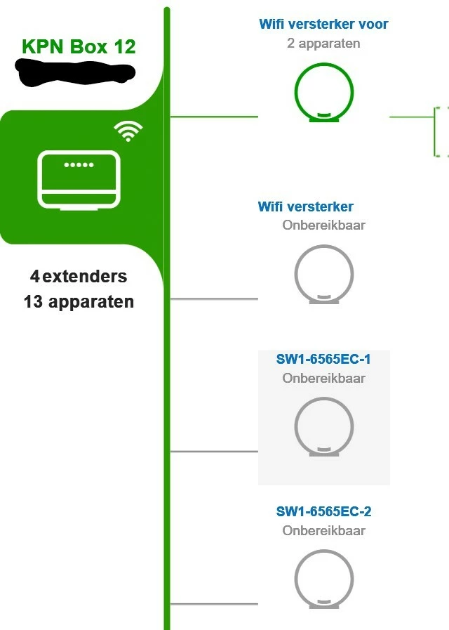 Gisteren het modem omgeruild voor de V12. Op aanraden van de KPN medewerker alleen 2 extenders aangesloten omdat 3 eventueel niet zou werken (?) . Het heeft een paar uur gewerkt en toen weer dit .