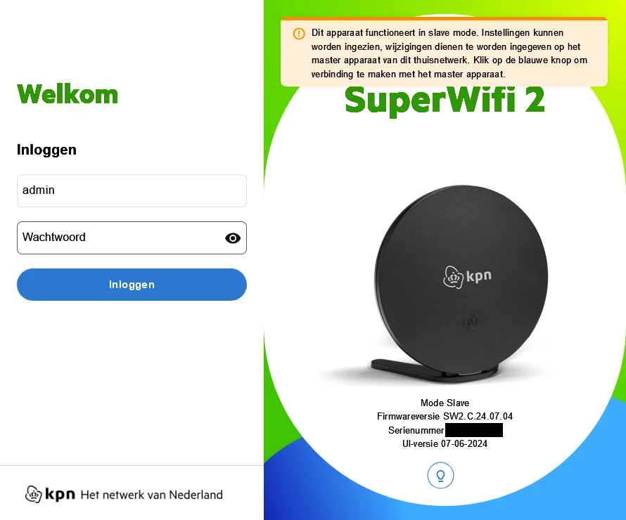 Dit apparaat functioneert in slave mode. Instellingen kunnen worden ingezien, wijzigingen dienen te worden ingegeven op het master apparaat van dit thuisnetwerk. Klik op de blauwe knop om verbinding te maken met het master apparaat.