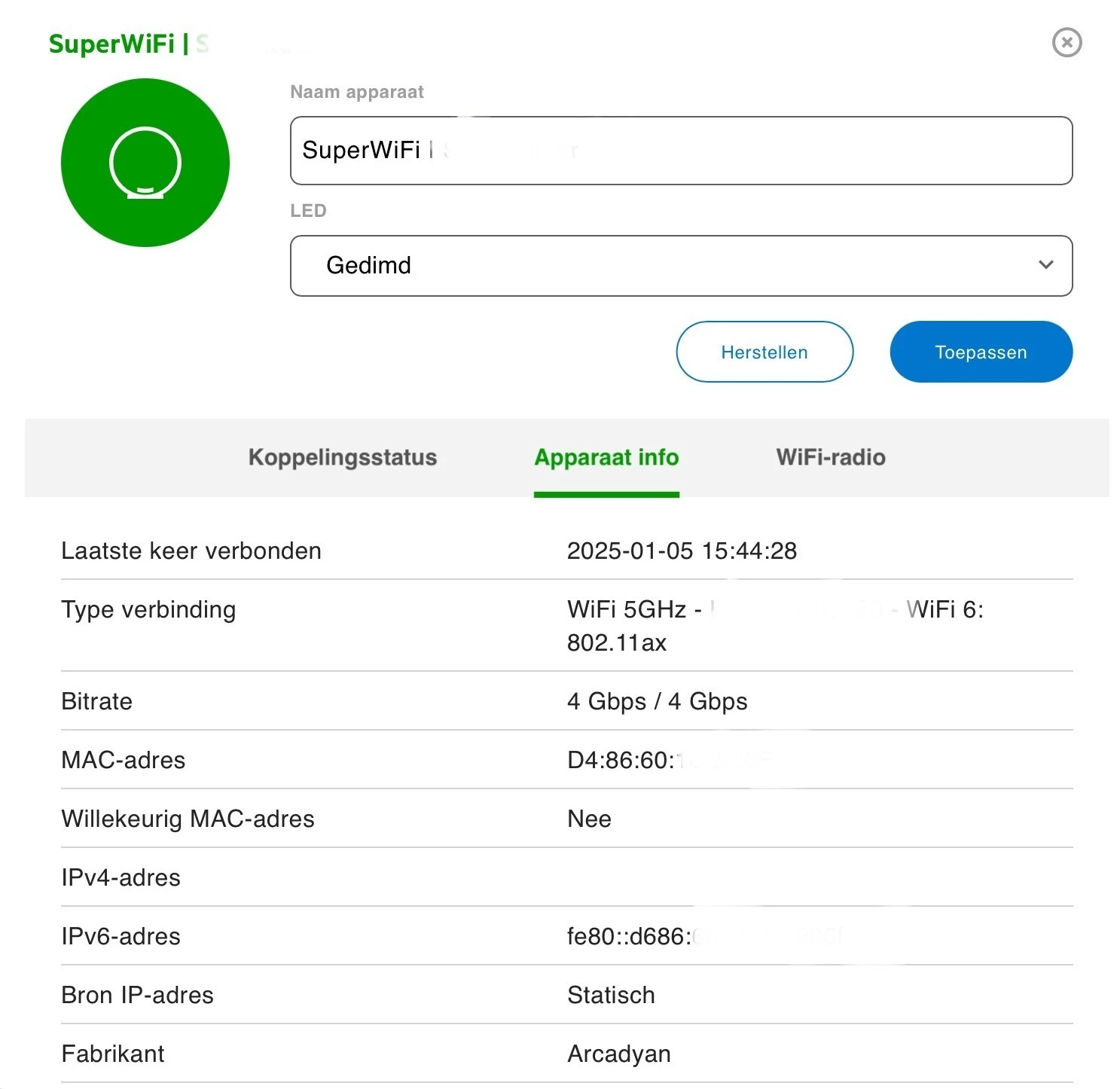 Ah ja. Onder Apparaat info zou dan normaal gesproken het IPv4-adres te vinden moeten zijn. Wat vreemd dat dat bij jou leeg is. Ik kreeg nog als tip mee om even de V10 te laten herstarten en als je daar mee bezig bent zou ik ook gelijk het SuperWifi punt een herstart geven. Hopelijk is daarna het IP-adres wel zichtbaar.