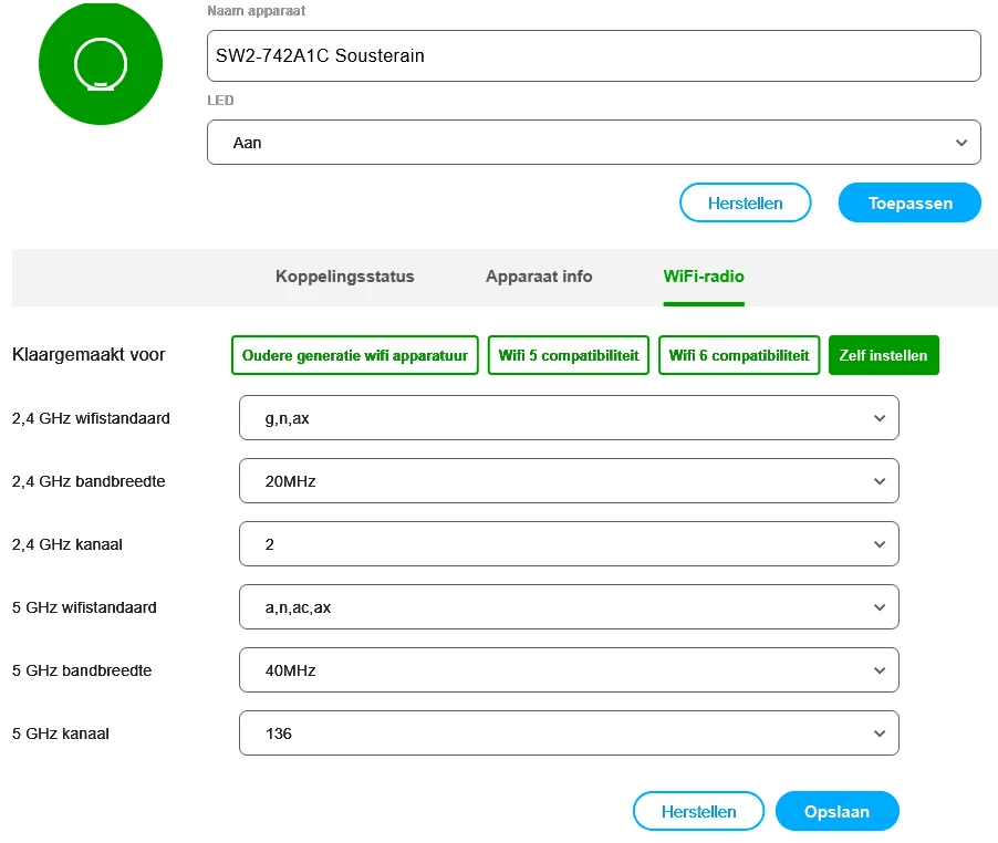 Verder alle wifiinstellingen zo veel mogelijk op AUTO laten staan, zodat de modem en de wifipunten goed samen kunnen werken.