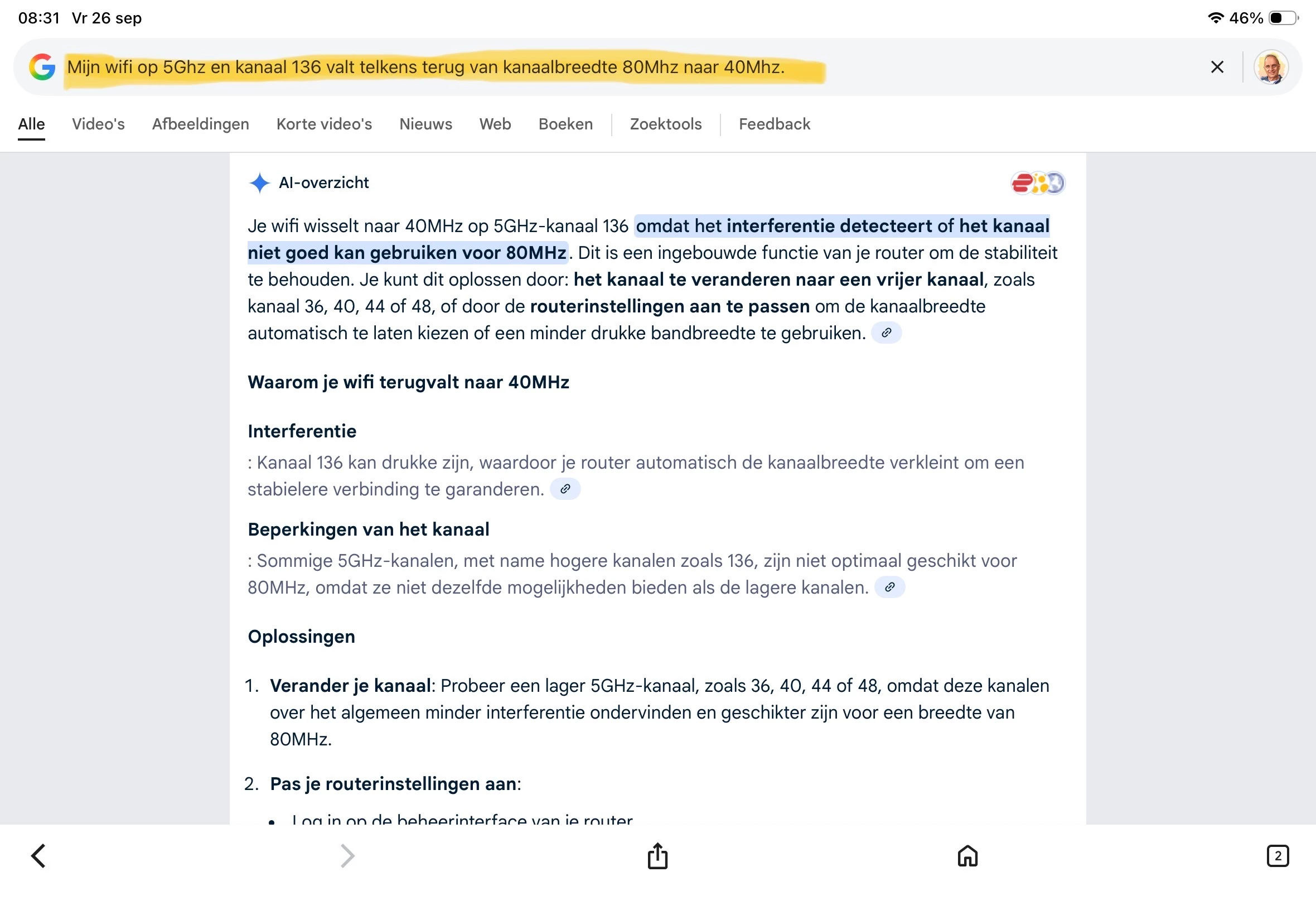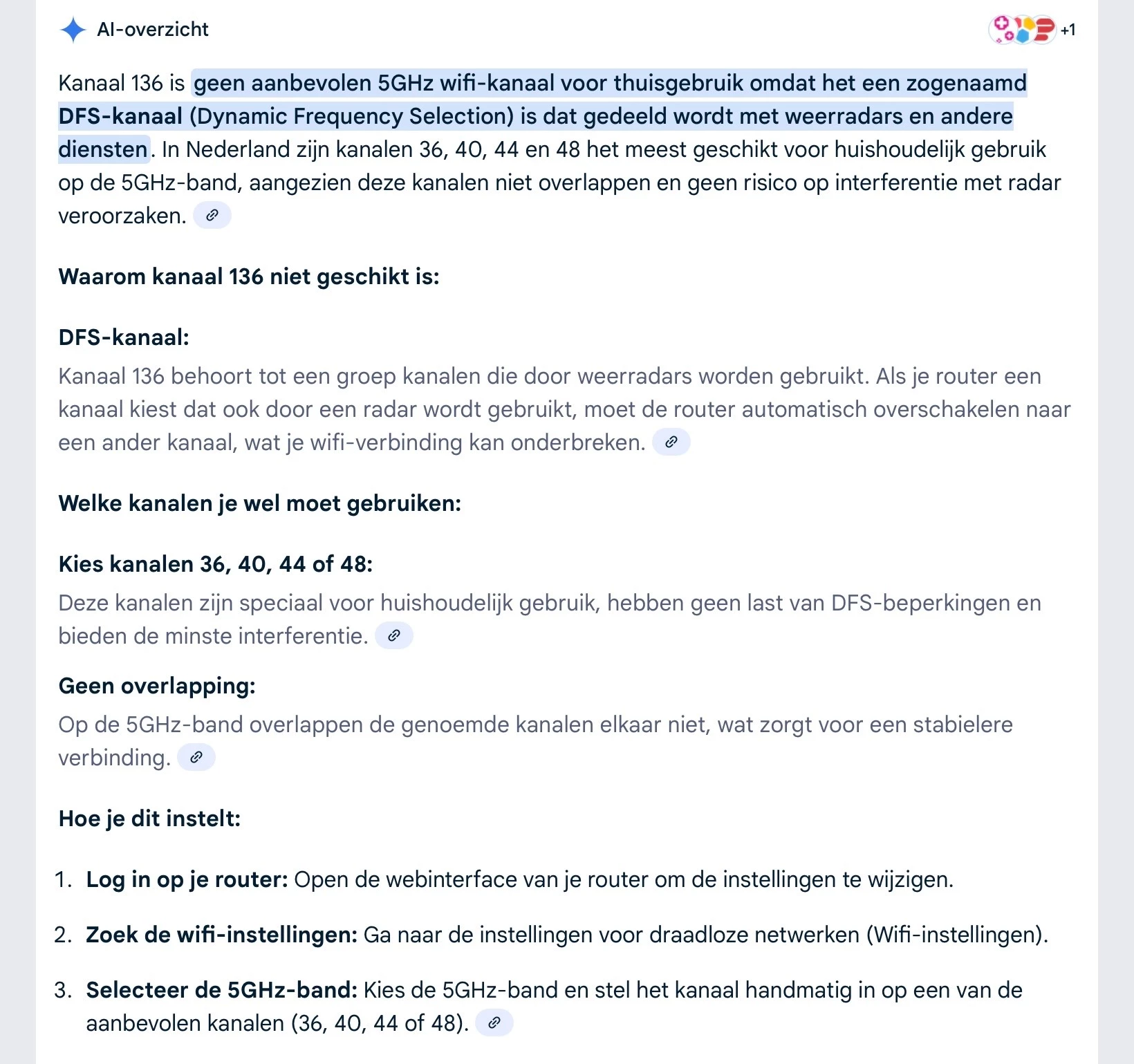 TIP gebruik eens wat vaker Google met zijn ingebouwde AI functie, want dat heb ik ook gedaan ook ik ben geen wifi expert 😉….zie voorbeeld hieronder.