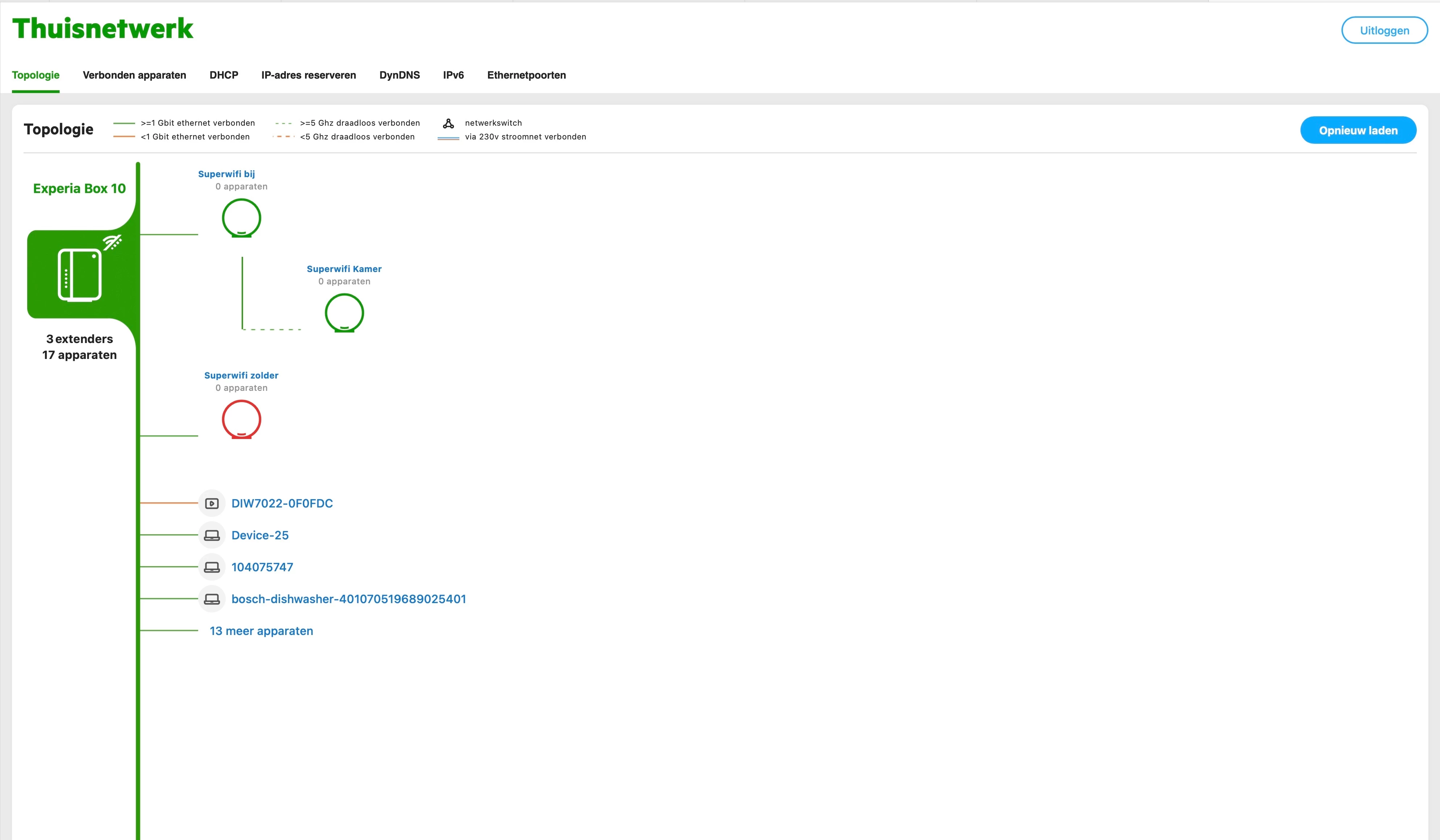 Rood in de topologie wil zeggen dat de onderlinge relatie tussen je modem als hoofdapparaat en je wifipunten als secundaire apparaat niet lekker zit. Er vindt dan geen sturing meer plaats in de mesh. Wat dan kan leiden tot een SuperWifi die wel groen brandt en waar je eindapparaten mee kunnen verbinden, maar waar die eindapparaten dan niet meer automatisch doorspringen naar een ander wifipunt als die beter is.