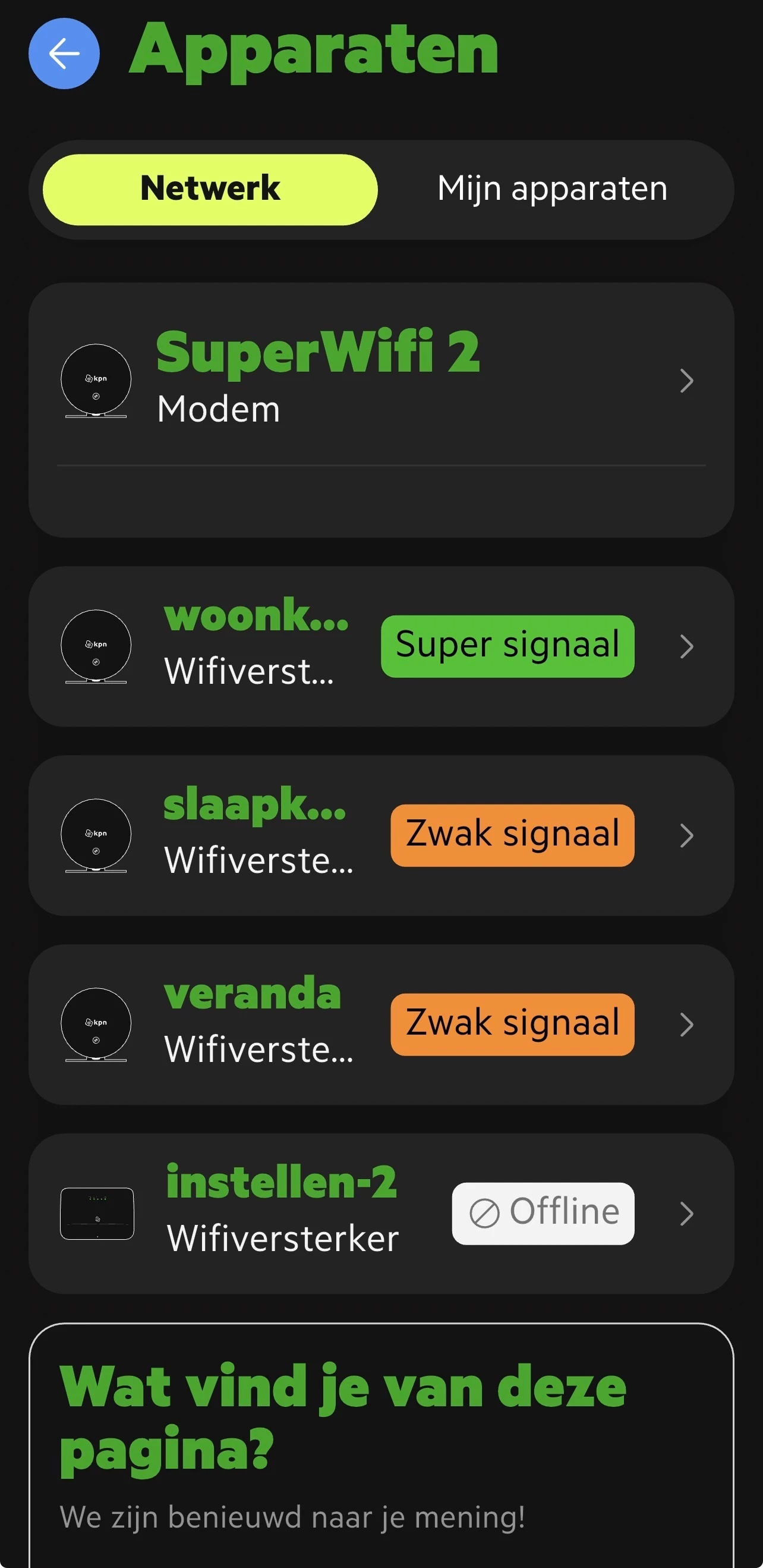 bedankt voor je reactie maar de superwifi punten staan prima (staan al maanden zo en geen probleem) maar sinds een maand heb ik vaker problemen met mijn kpn router ( die nu offline staat zoals te zien in de foto, instellen-2 en mijn super wifi waarvan het eerste punt nu ineens een superwifi modem is. :-). Ik vraag me dan ook af wat er gebeurd want als ik met de pc inlog op de router zijn er 51 apparaten online. Kortom het is een grote … en ik snap er niets vandaag